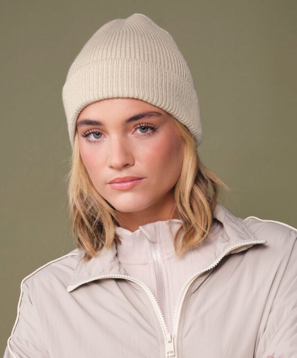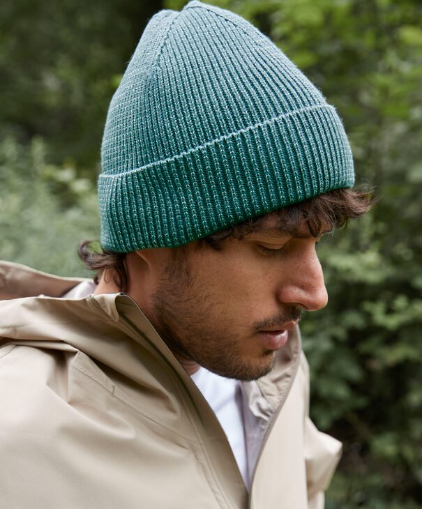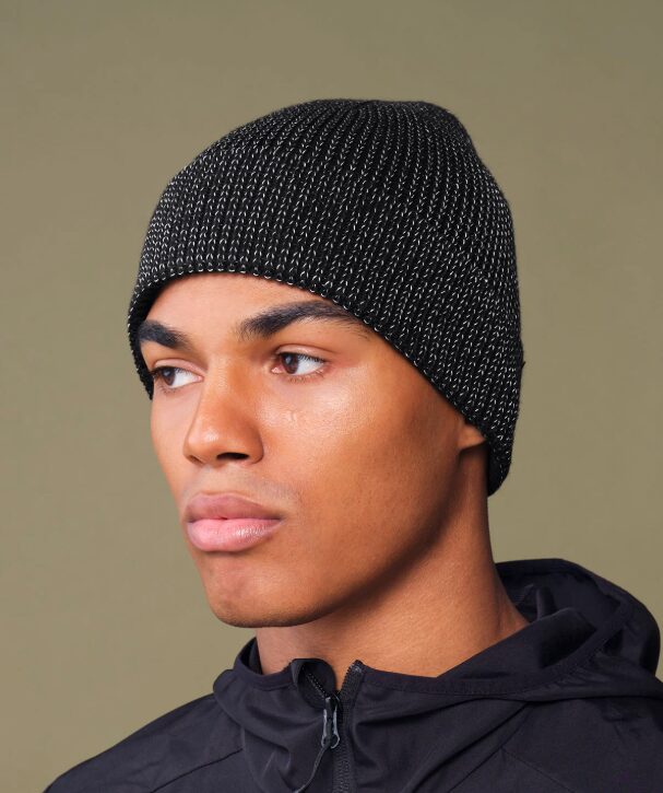 こちらの軽量リサイクルビーニーは、100%認証リサイクルポリエステルを使用し、反射繊維を織り込むことで暗い場所でも視認性を高めています。